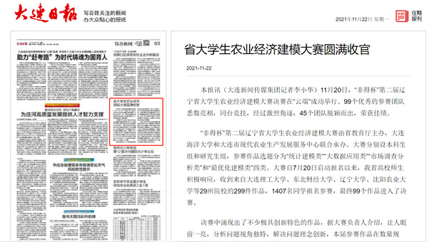 11月20日,我校“实践教学及创新创业教育活动周”竞赛部分主要活动——“非得杯”第二届辽宁省大学生农业经济建模大赛决赛在“云端”举行。本次大赛由辽宁省教育厅主办,我校经济管理学院和大连市农业农村发展服务中心联合承办。来自大连理工大学、东北大学、辽宁大学、沈阳农业大学等21所高校的99个优秀参赛团队同台竞技参与线上角逐,最终45个团队脱颖而出喜获佳绩。