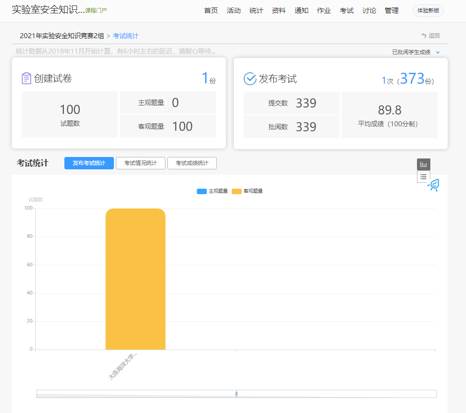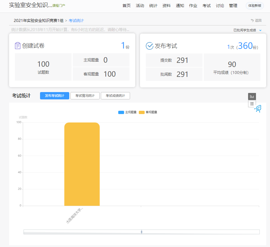 11月18日,我校举办“实践教学及创新创业教育活动周”之“实验安全知识竞赛”。本次竞赛由教务处和创新创业学院联合主办、海洋科技与环境学院承办,全校共11个学院(含应用技术学院)共计733名学生报名参加比赛,实际成功参赛学生627名,依据泛雅平台自动评分和后台数据,再结合竞赛评分标准,最终251名学生获得等级奖励,其中一等奖42名、二等奖84名、三等奖125名,有188名学生获得优秀奖。
