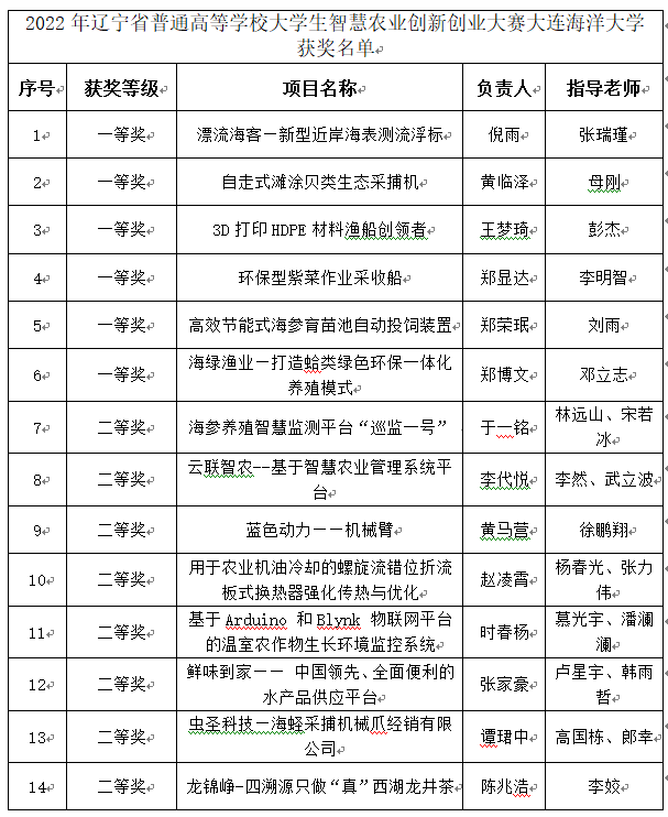 近日,2022年辽宁省普通高等学校大学生智慧农业创新创业大赛落下帷幕。经过激烈角逐,我校师生在791个项目中脱颖而出,共荣获一等奖6项、二等奖8项。