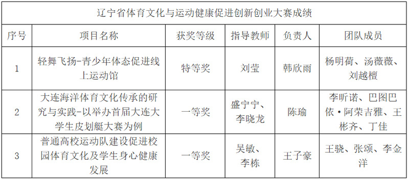 近日,辽宁省体育文化与运动健康促进创新创业大赛落下帷幕,共有654个项目, 2646人次参加了本次竞赛。经过学生自主报名、学校审核推荐、项目展示及答辩等环节,我校7个参赛团队共获得特等奖1项,一等奖2项,其中刘莹老师被评为优秀指导教师。获奖名单如下: