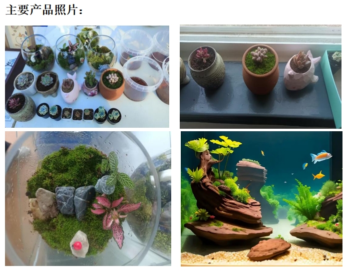 多肉种植的主要品种有吉娃娃、玉露、花月夜、绮罗、垂盆草等。微景观造景以玻璃瓶、生态缸等透明容器为载体,利用苔藓、蕨类植物(如银线蕨、网纹草)、搭配装饰品(如卡通玩偶、砂石、小桥等),构建出一个小型的自然场景。常用于家居装饰、办公桌摆件或公共空间美化。