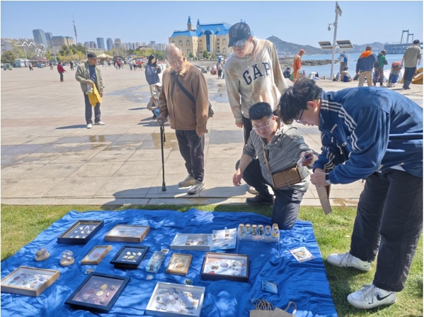 假期中间的几天,游客如潮水般涌入大连。蓝谷文创等创业团队带着前期创作的海洋文创产品到黑石礁公园等景点开展“海易”创业集市,团队成员们分工明确,有的负责搬运货物,有的负责搭建摊位,有的负责布置装饰,每个人都干劲十足。