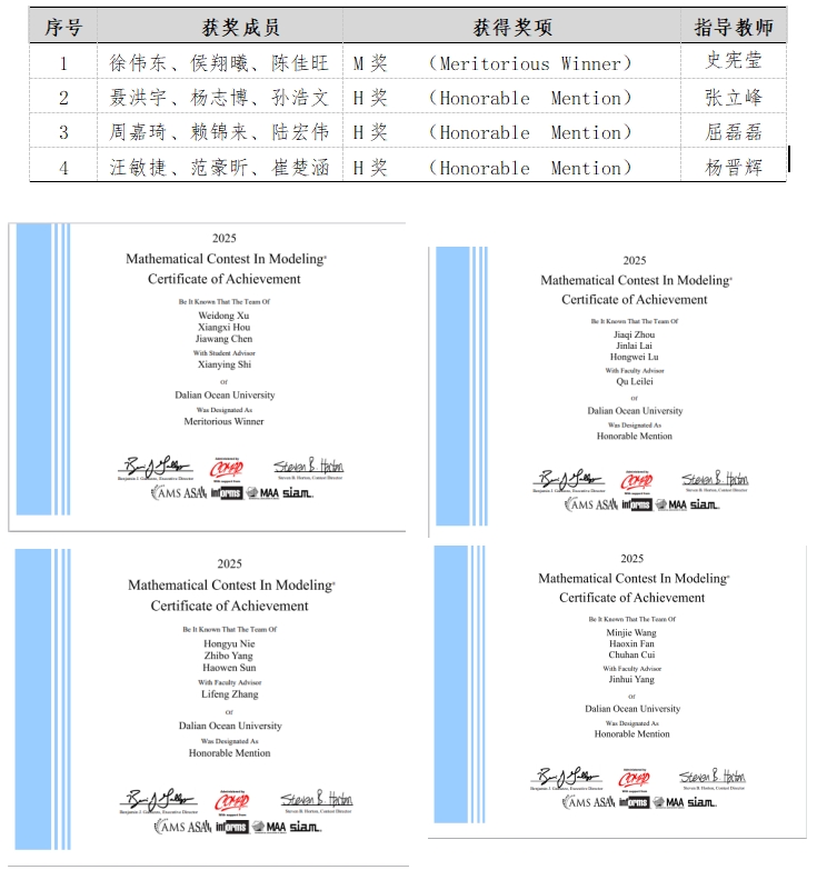 近日,2025年美国大学生数学建模竞赛(MCM)成绩揭晓,我校参赛队伍取得了优异的成绩,获得一等奖1项、二等奖3项。