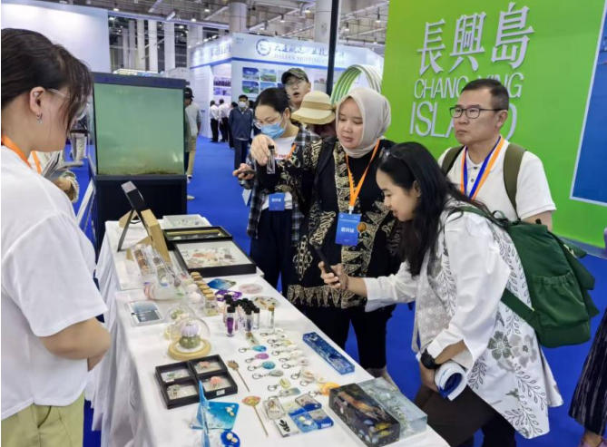 来自不同地区的参展者纷纷驻足,或仔细端详展品,或与团队成员交流创作理念。有外国友人拿起文创产品,饶有兴致地询问制作工艺与设计灵感;也有市民带着孩子前来,在观赏中让孩子感受海洋文化的魅力。大家对团队的创意和产品品质给予了高度评价,不少人现场表达了合作意向或购买意愿。